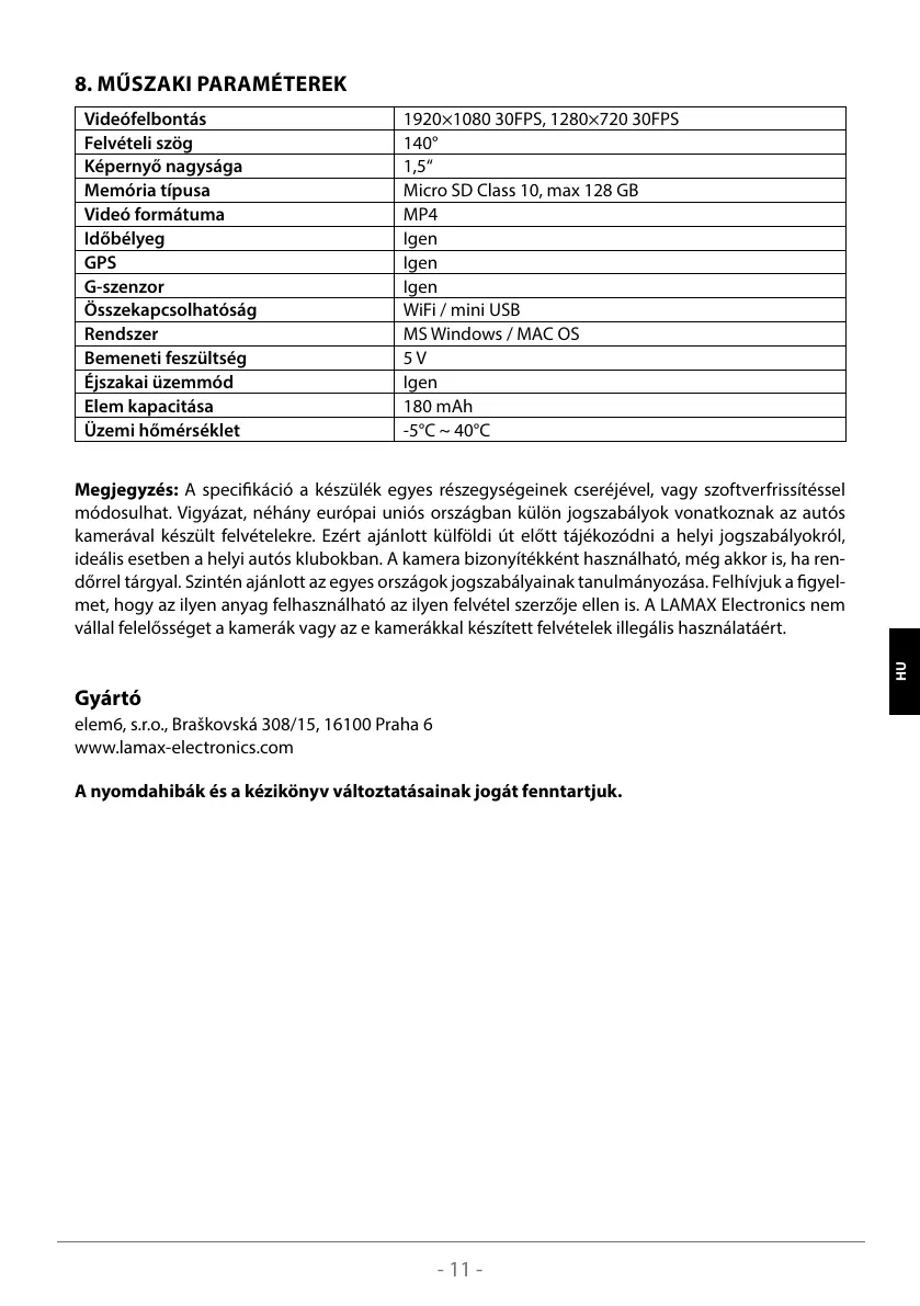 Megjegyzés: A specikáció a készülék egyes részegységeinek cseréjével, vagy szoftverfrissítéssel