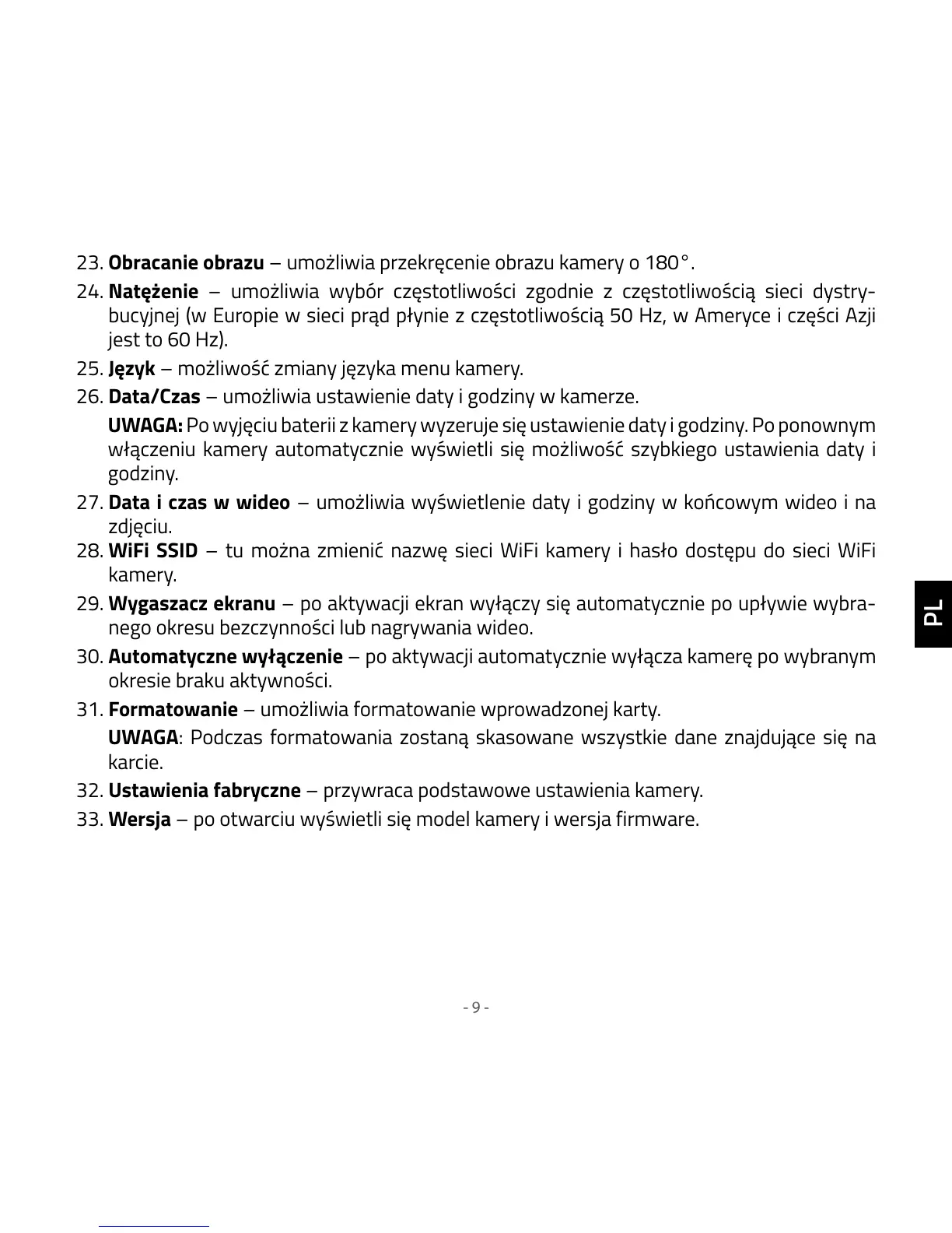 30. Automatyczne wyłączenie – po aktywacji automatycznie wyłącza kamerę po wybranym