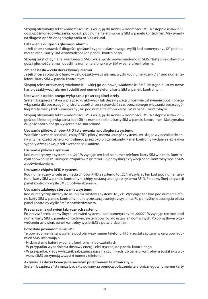 nym spowodujesz usunięcie czujników z systemu. Po pomyślnej aktywacji panel kontrolny wyśle SMS