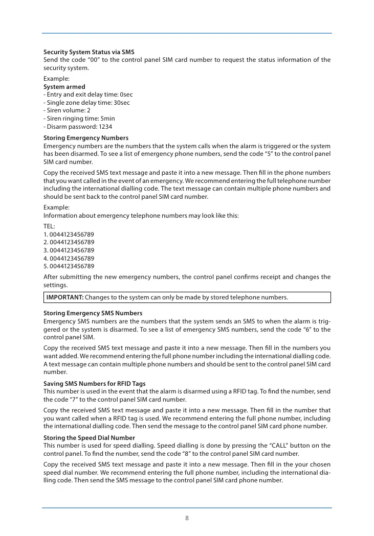 Emergency SMS numbers are the numbers that the system sends an SMS to when the alarm is trig-