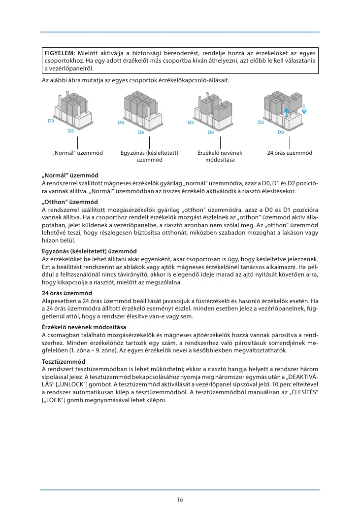 A rendszerrel szállított mozgásérzékelők gyárilag „otthon” üzemmódra, azaz a D0 és D1 pozícióra