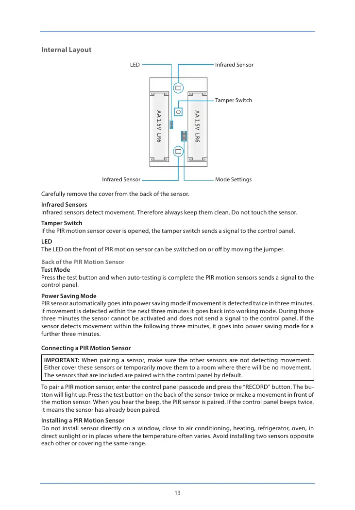 To pair a PIR motion sensor, enter the control panel passcode and press the āRECORDā button. The bu-