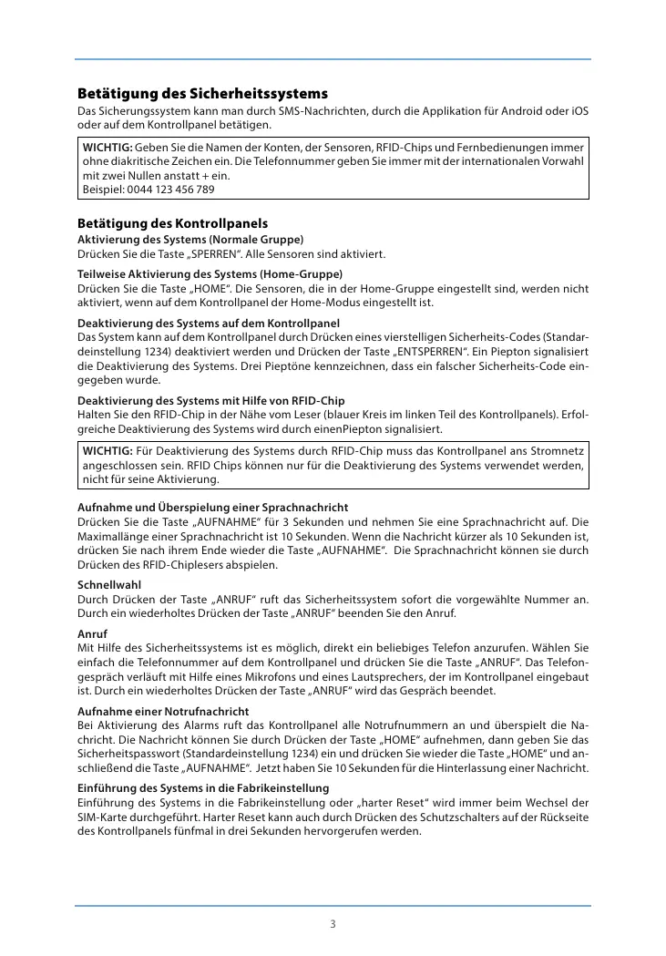 WICHTIG: Für Deaktivierung des Systems durch RFID-Chip muss das Kontrollpanel ans Stromnetz
