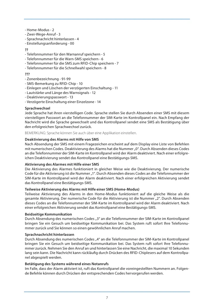 dieses Codes an die Telefonnummer der SIM-Karte im Kontrollpanel wird der Alarm deaktiviert. Nach