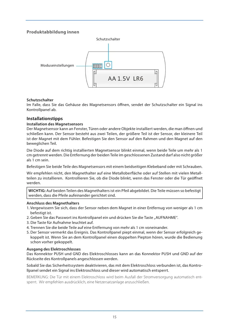 Im Falle, dass Sie das Gehäuse des Magnetsensors önen, sendet der Schutzschalter ein Signal ins