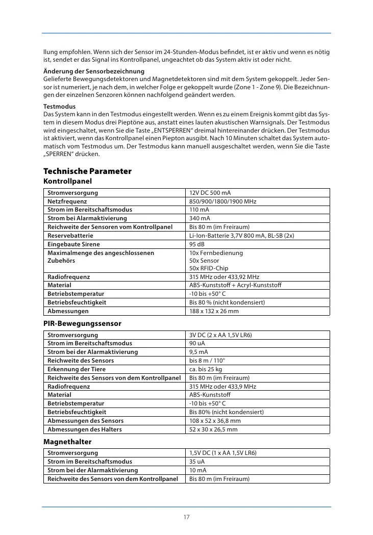 Reichweite der Sensoren vom Kontrollpanel Bis 80 m (im Freiraum)
