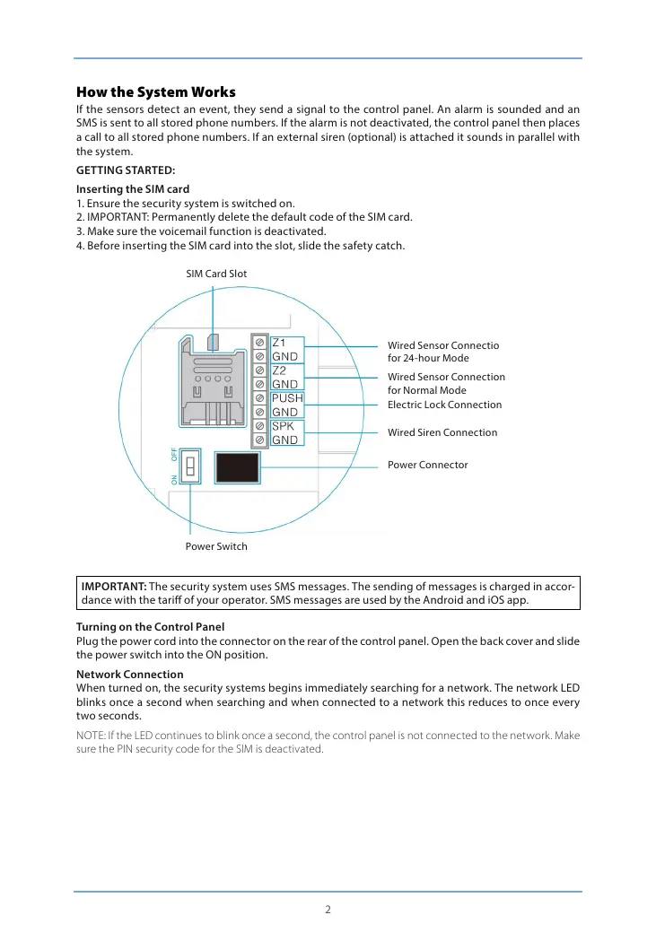 IMPORTANT: The security system uses SMS messages. The sending of messages is charged in accor-