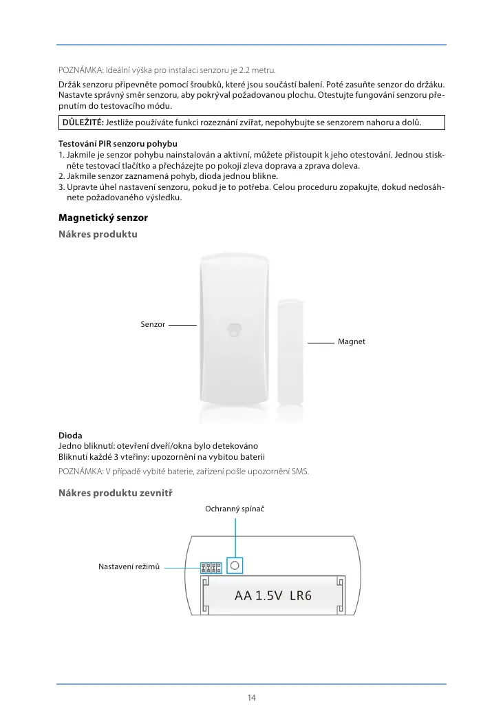 POZNÁMKA: Ideální výška pro instalaci senzoru je 2.2 metru.