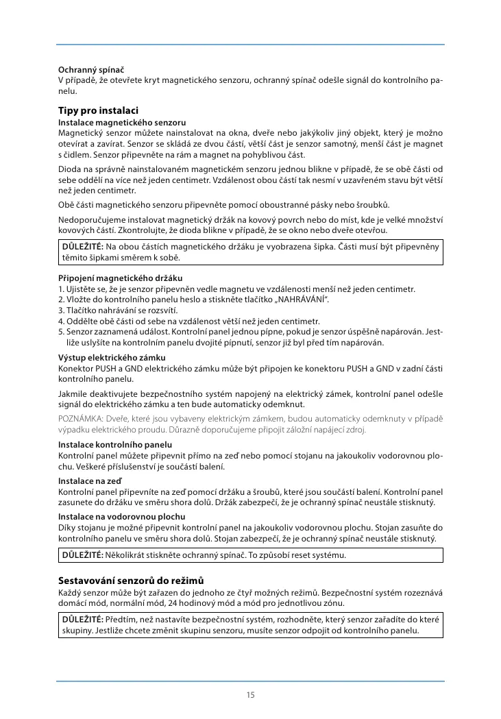 DŮLEŽITÉ: Předtím, než nastavíte bezpečnostní systém, rozhodněte, který senzor zařadíte do které