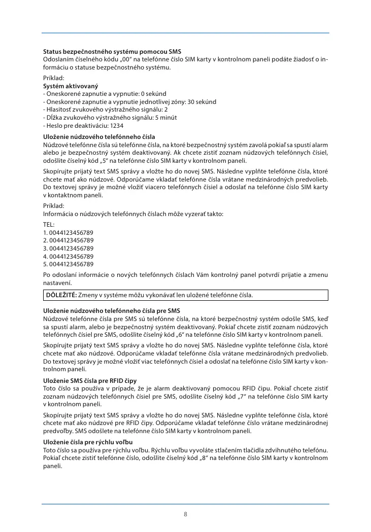 DÔLEŽITÉ: Zmeny v systéme môžu vykonávať len uložené telefónne čísla.