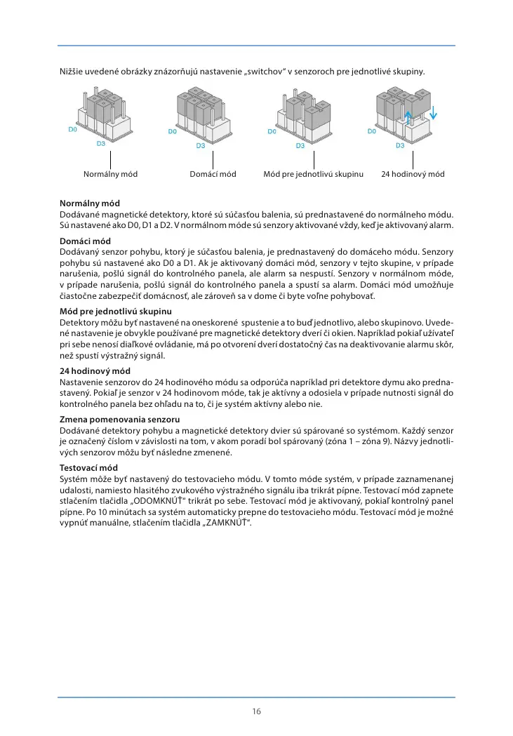 Sú nastavené ako D0, D1 a D2. V normálnom móde sú senzory aktivované vždy, keď je aktivovaný alarm.