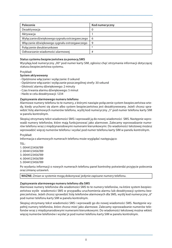 zeństwa wyśle wiadomości SMS w przypadku uruchomienia alarmu lub dezaktywacji systemu bez-