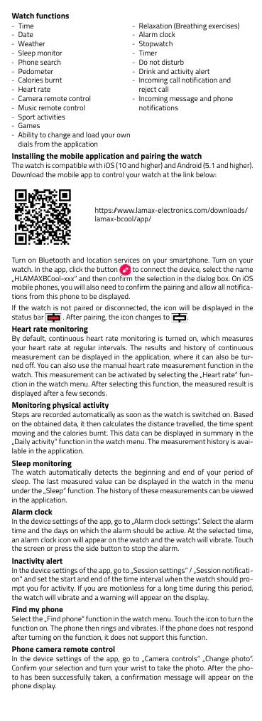 LAMAX BCool - Watch functions; Installing the mobile application and pairing the watch; Heart rate monitoring; Monitoring physical activity