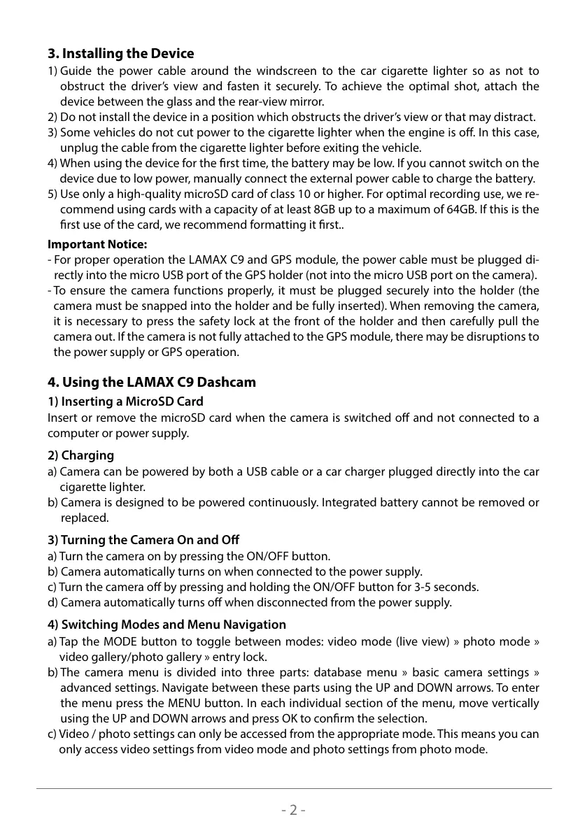 - For proper operation the LAMAX C9 and GPS module, the power cable must be plugged di-