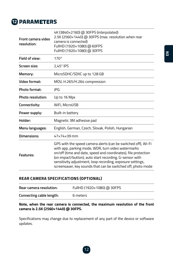 Note, when the rear camera is connected, the maximum resolution of the front