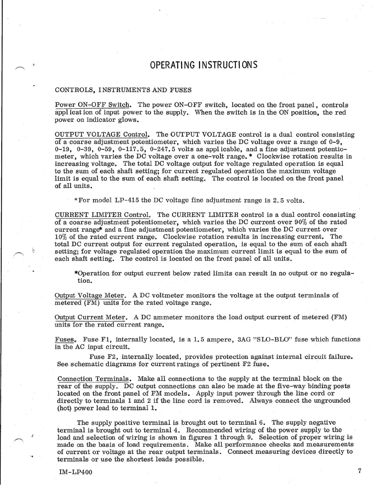 Lambda LP Series - Operating Instructions; Controls, Instruments, and Fuses; Connection Terminals and Wiring