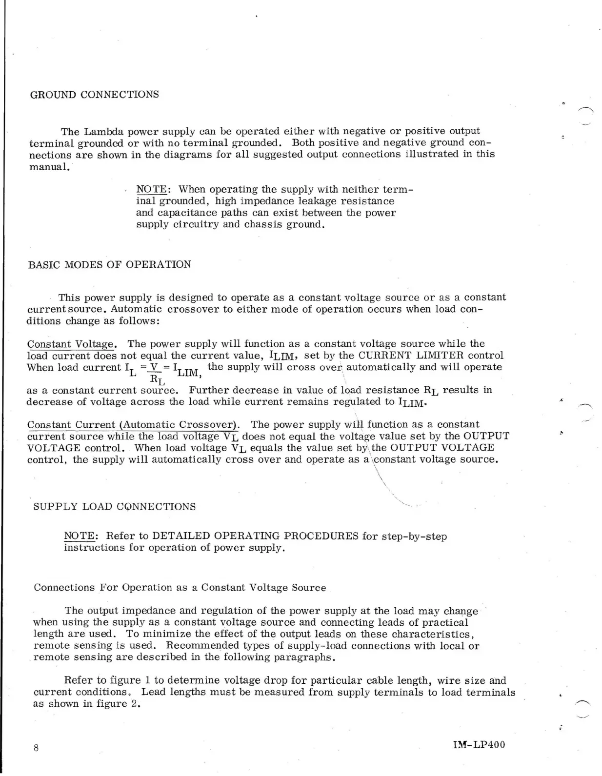 Lambda LP Series - Ground Connections and Modes; Grounding Options; Basic Modes of Operation; Supply Load Connections