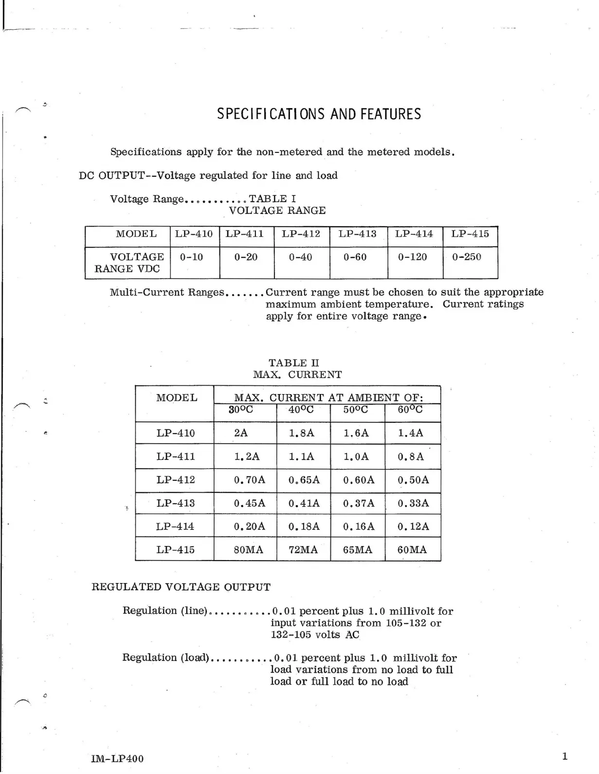 Lambda LP Series - Specifications and Features; DC Output Regulation; Voltage and Current Ranges; Regulated Voltage Output