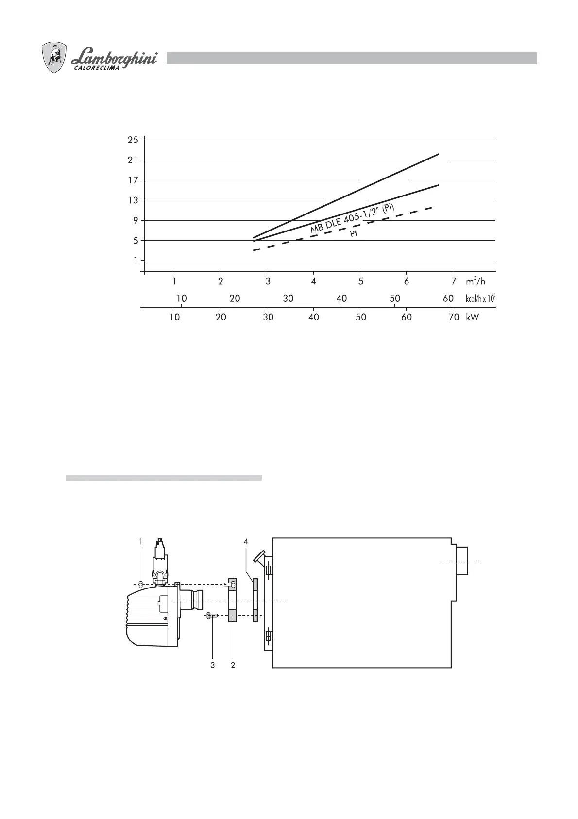 Fixer la bride 2 à la chaudière à l’aide des 4 vis 3 en interposant le joint isolant 4. Enfiler le brûleur dans la bride de