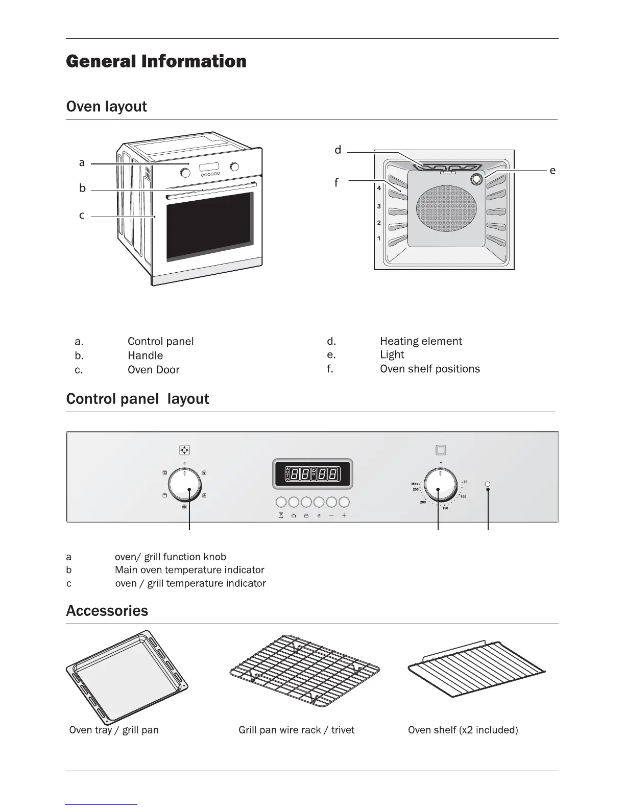 Lamona LAM3404 - Oven Identification and Components; Oven Layout Diagram; Control Panel Layout; Included Oven Accessories