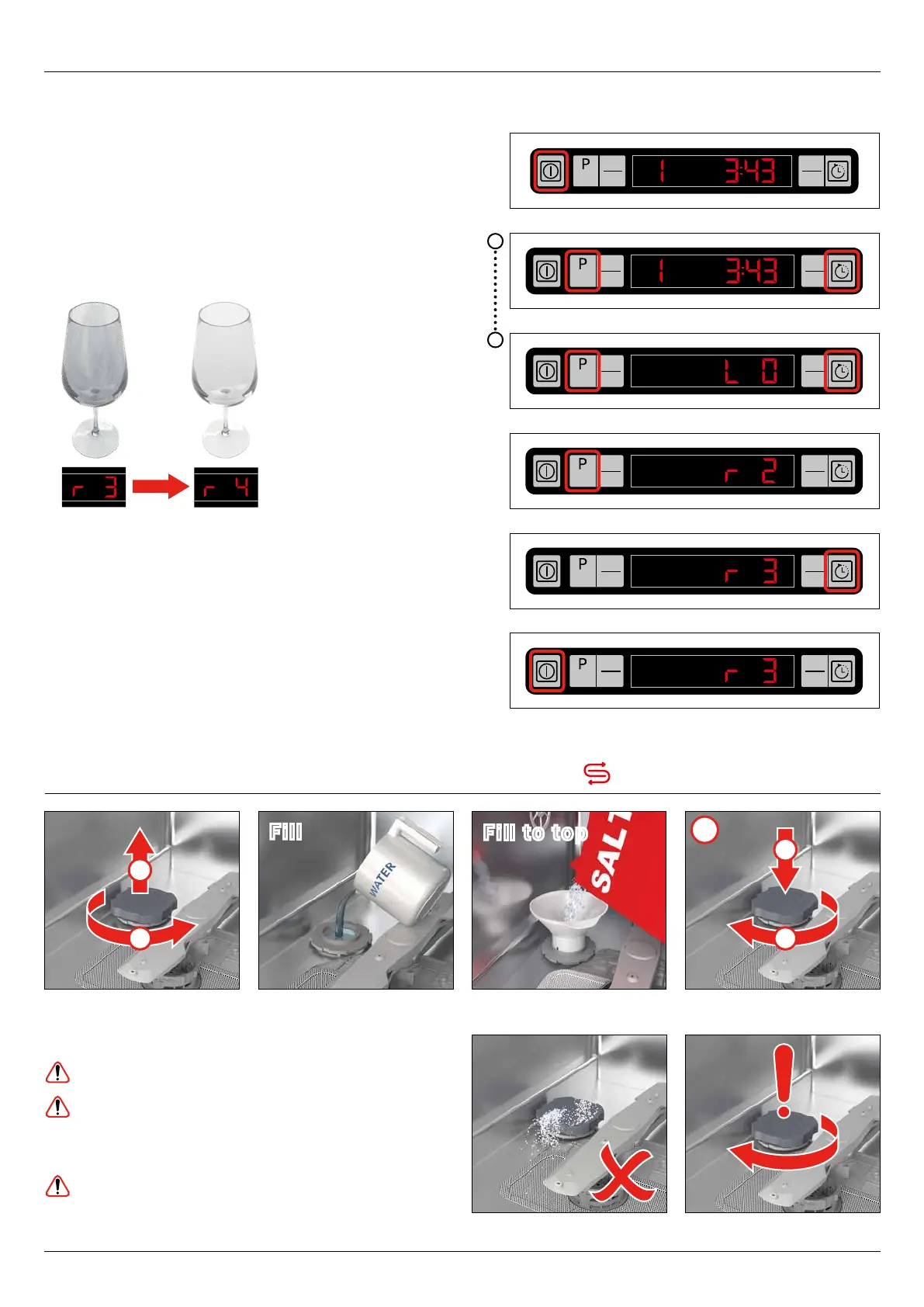 Select correct water hardness salt setting to ensure wash performance and protect the machine’s components.