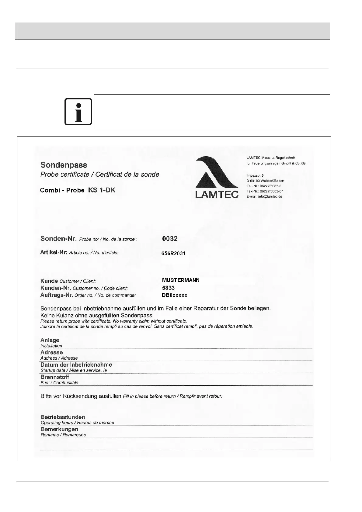 The probe passport must always be enclosed in the case of complaints and repairs.