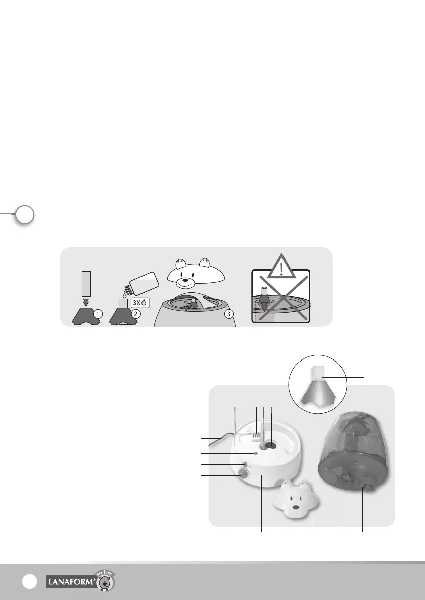 • Der Luftbefeuchter ist mit einer Schale für ätherische Öle (nicht mitgeliefert) ausgestattet. Vor Verwendung von