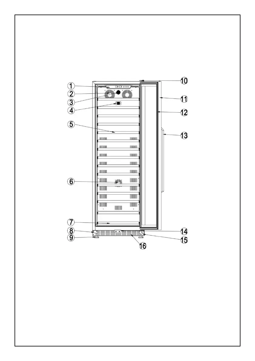 fall device of the door (9) Adjustable feet (10) Upper hinge (11) Glass