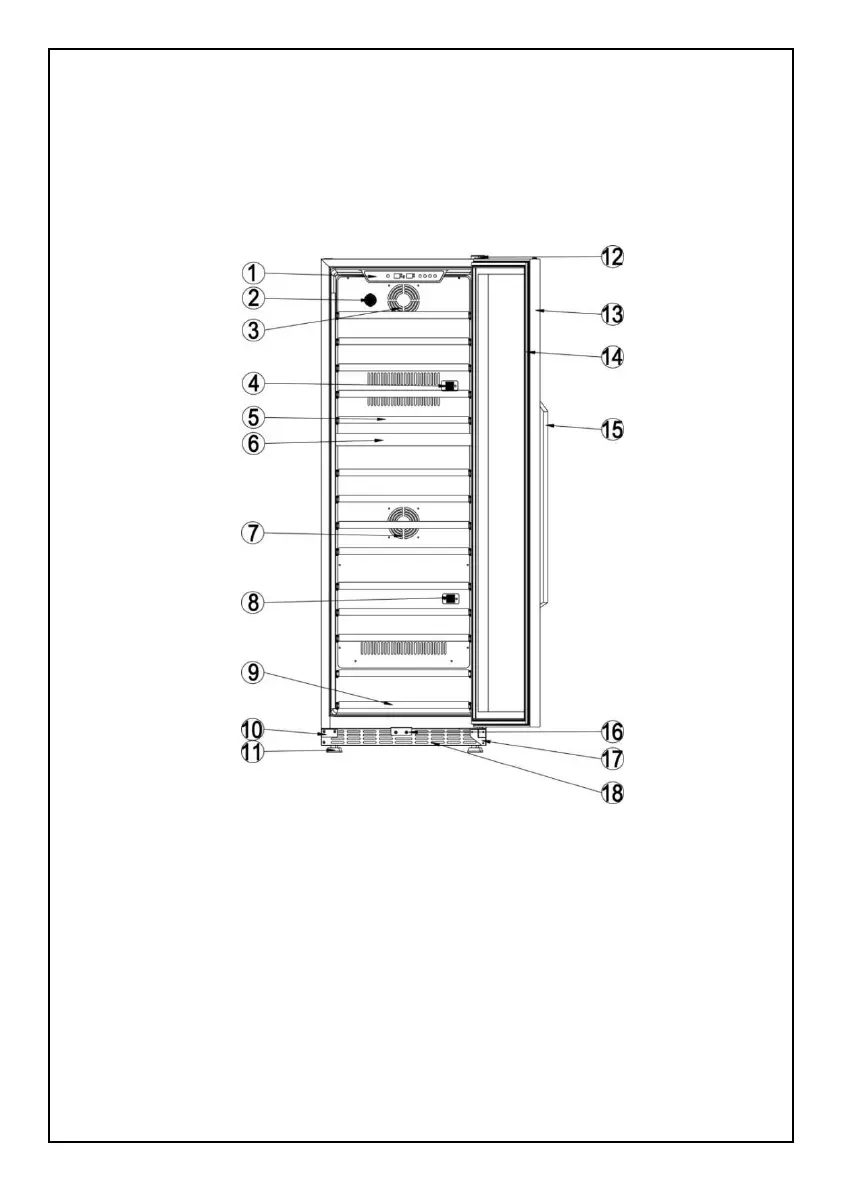 (11) Adjustable feet (12)Upper hinge (13) Glass door with lock (14) Door gasket