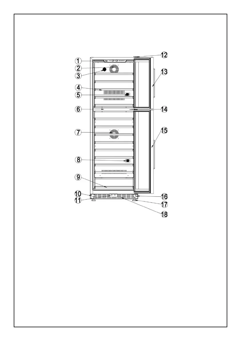 wooden shelf (5) The upper sensor (6) Baffle plate (7) The fan of evaporator