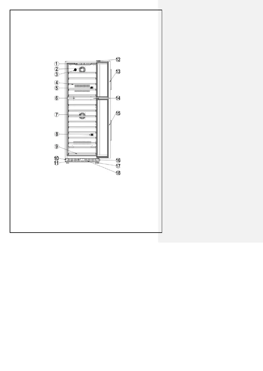 (11) Adjustable Feet (12) Upper Door Hinge (13) Glass Door With Lock (14)