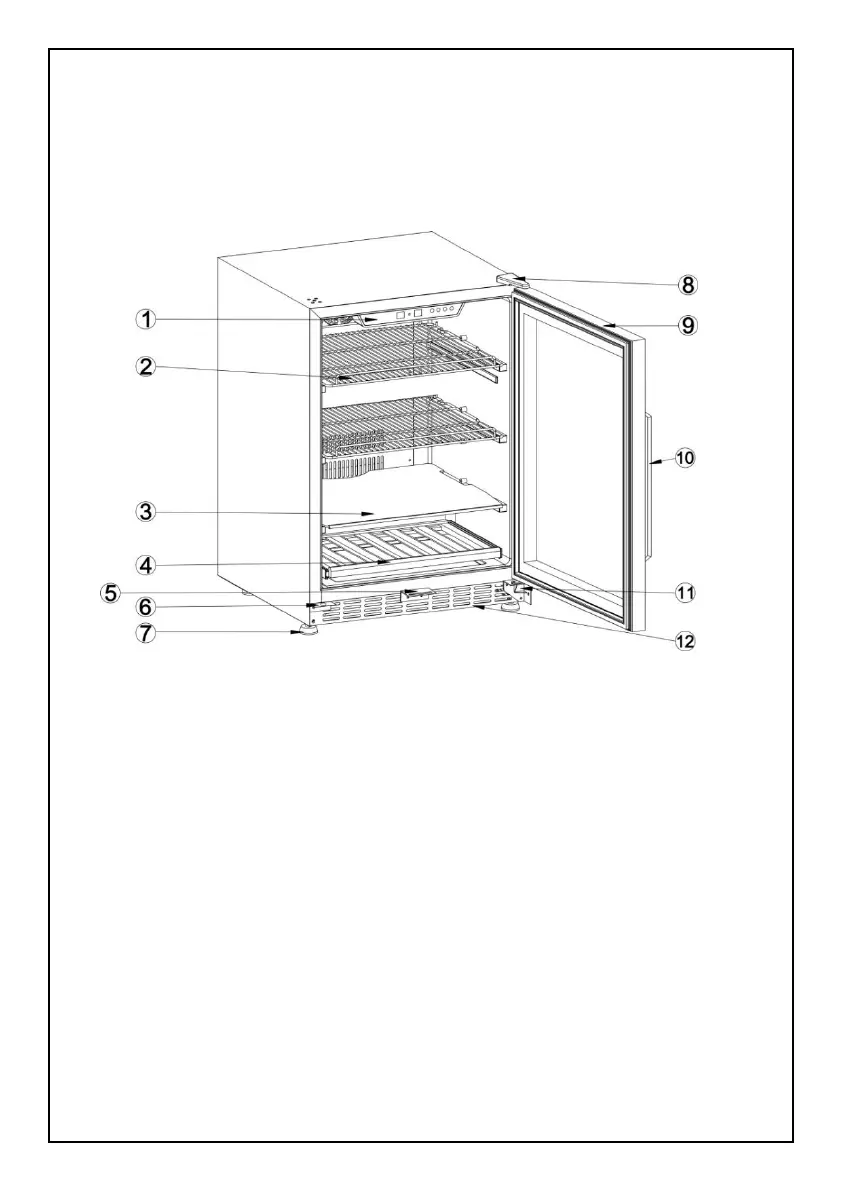 hinge (9) Glass door with lock/ gasket (10) Handle (11) Lower hinge