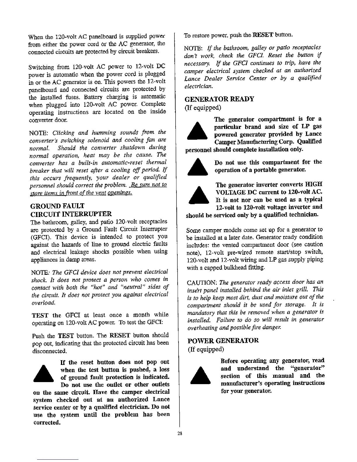 Lance 2001 model - Ground Fault; Circuit Interrupter; Generator Ready; Power Generator