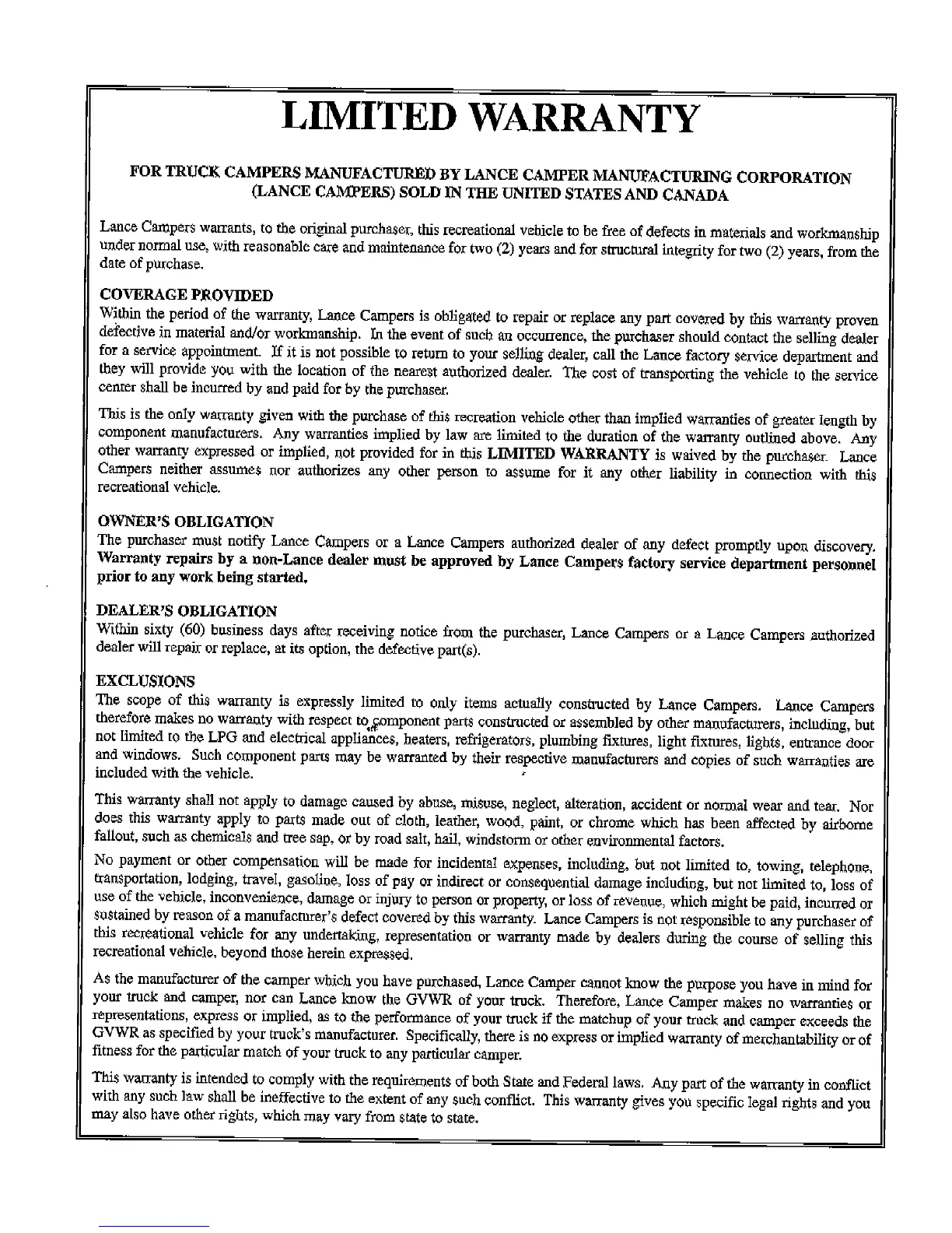 Lance 2001 model - INTERIOR FEATURES; Dinette Bed Conversions; Luggage;Child Restraint System; Cargo Net