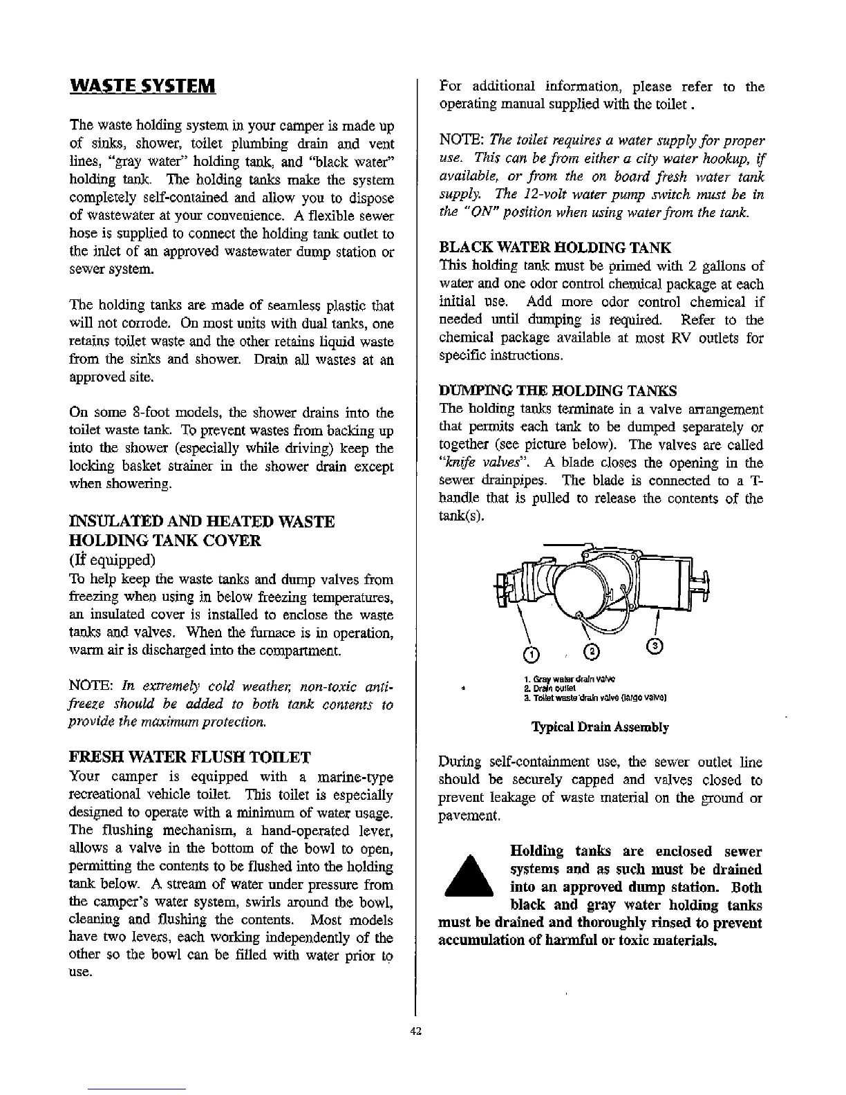Lance 2001 model - Waste System; Insulated and Heater Waste Holding Tank Cover; Fresh Water Flush Toilet; Dumping the Holding Tanks