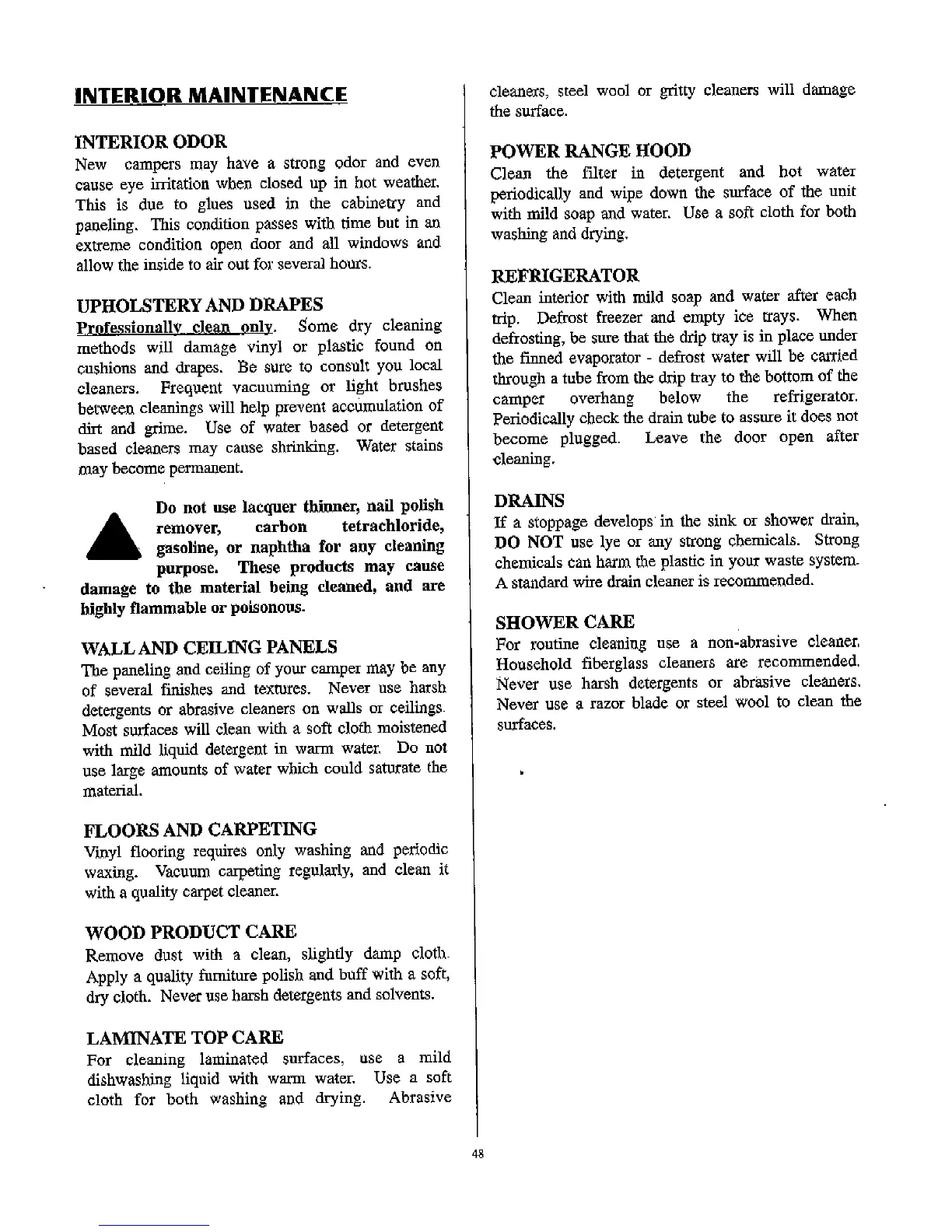 Lance 2001 model - Interior Maintenance; Upholstery and Drapes; Power Range Hood; Refregierator