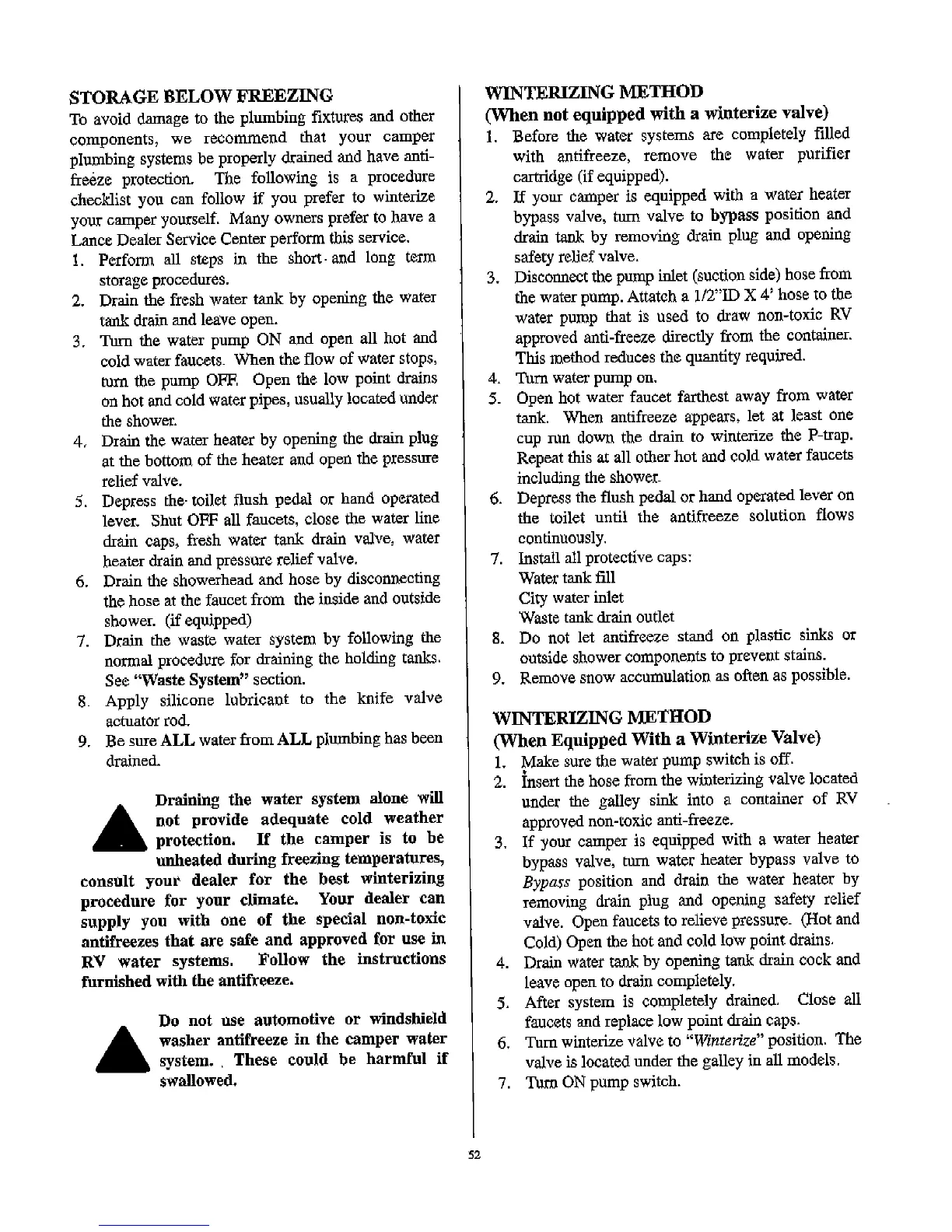Lance 2001 model - Storage below Freezing; Winterizing Method
