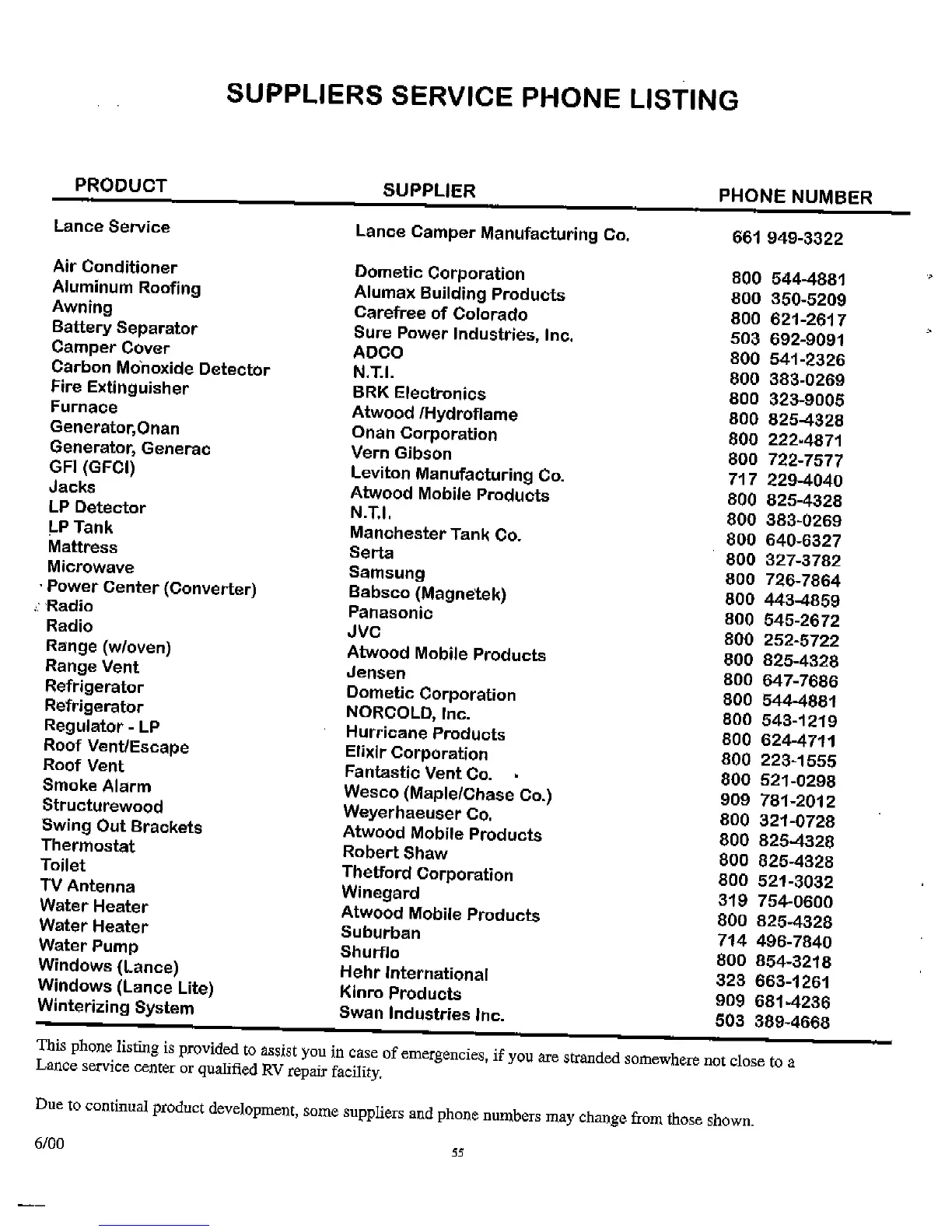Lance 2001 model - Phone Listing