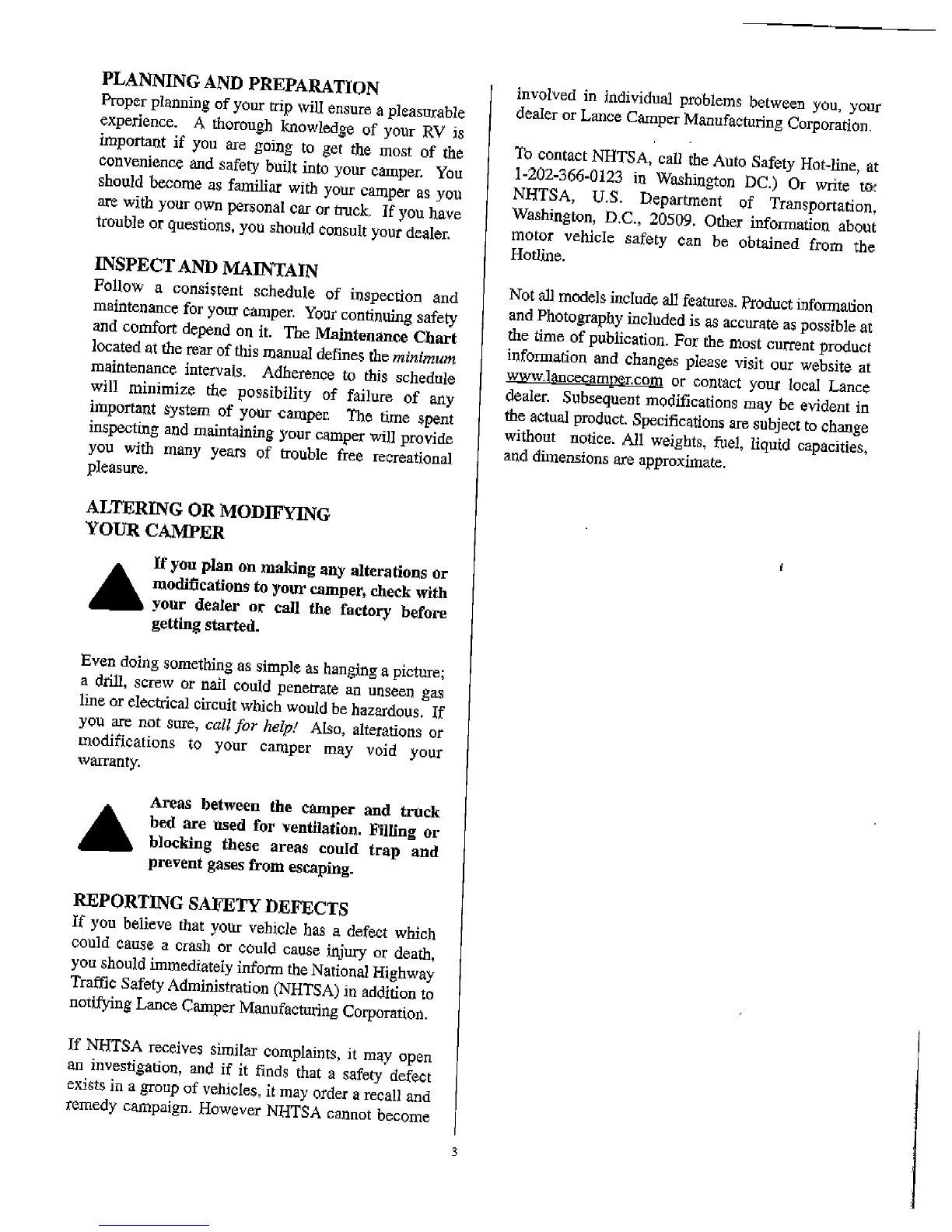 Lance 2002 - Planning and Preparation; Inspect and Maintain; Altering or Modifying Your Camper; Reporting Safety Defects