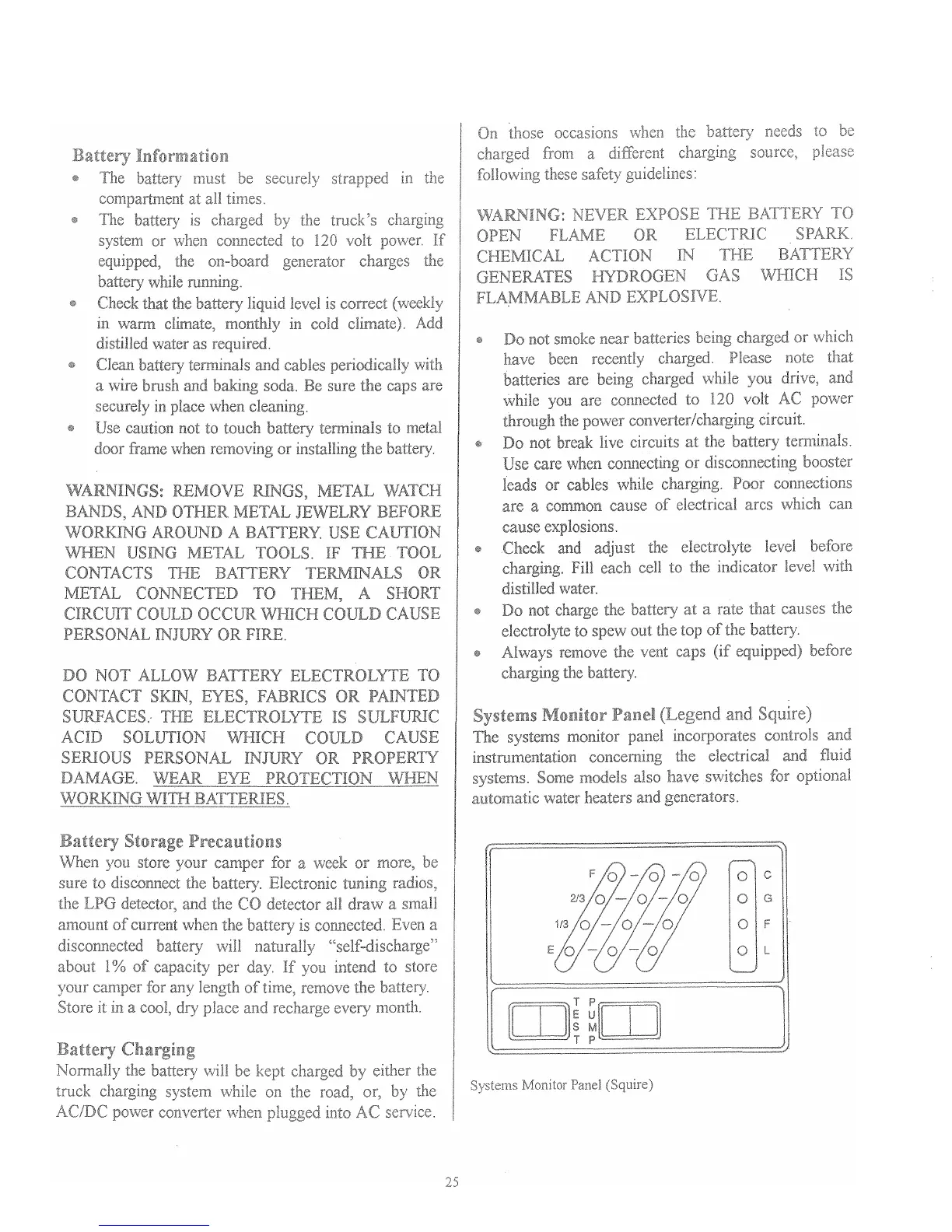 Lance Legend - Battery Information; Battery Storage Precautions; Battery Charging; Systems Monitor Panel