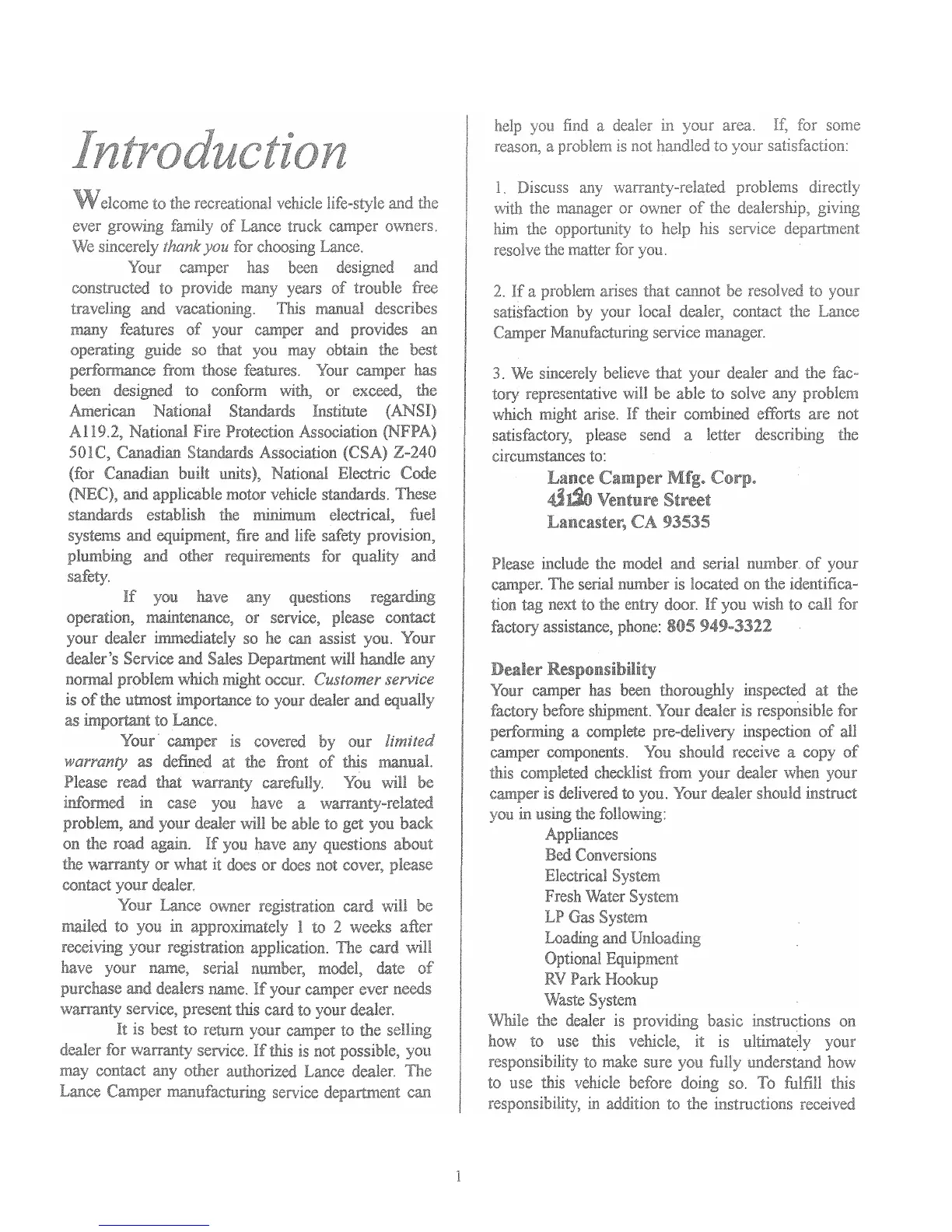 Lance Legend - Dealer Responsibility; Identification Information