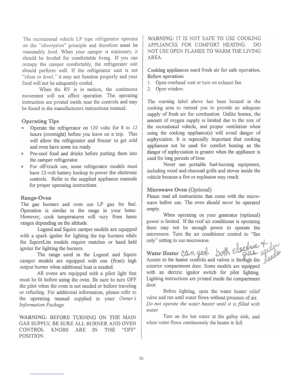 Lance Legend - Water Heater and Furnace Operation; Fresh Water System