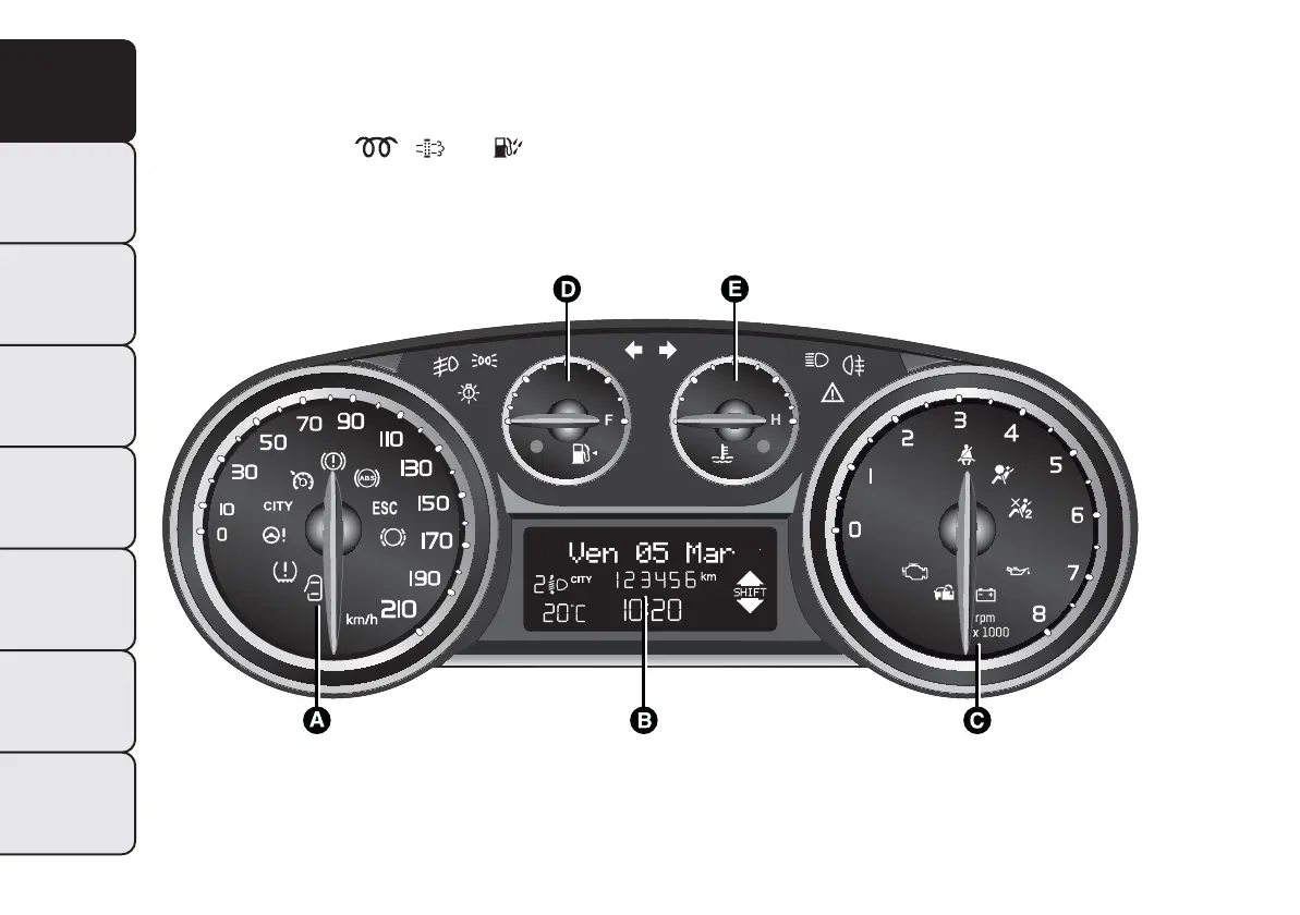 A. Speedometer (speed indicator) B. Multifunction display C. Rev counter D. Fuel level gauge with reserve warning