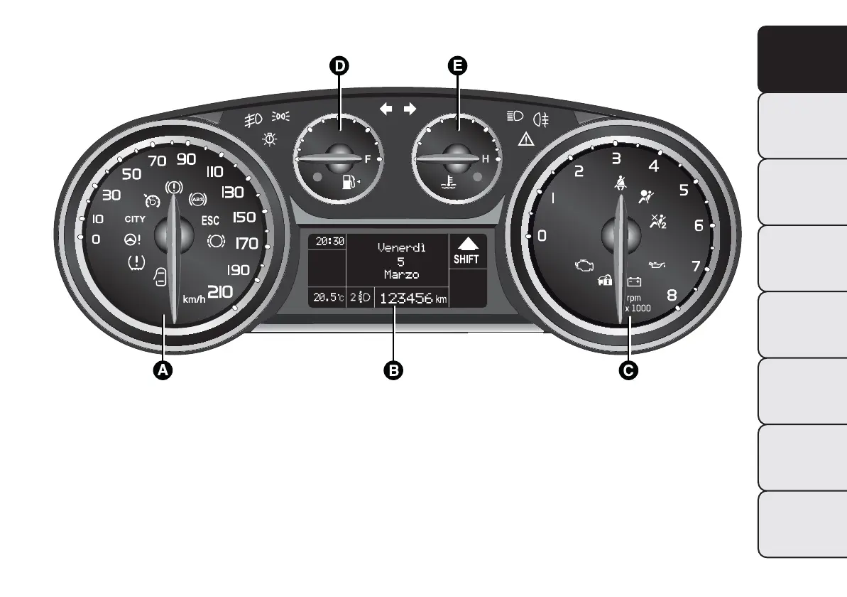 A. Speedometer (speed indicator) B. Reconfigurable multifunction display C. Rev counter D. Fuel level gauge with