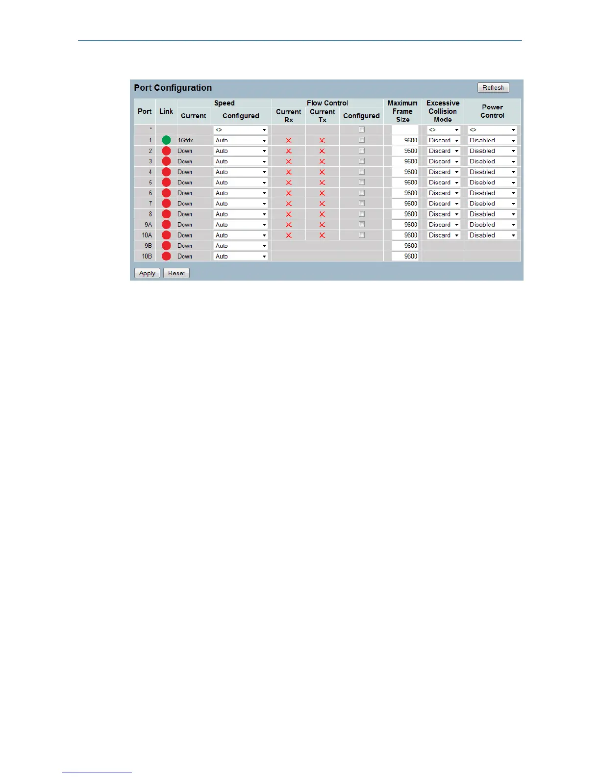 frames on the port are obeyed, and the Current Tx column indicates whether pause frames on the port are transmitted.