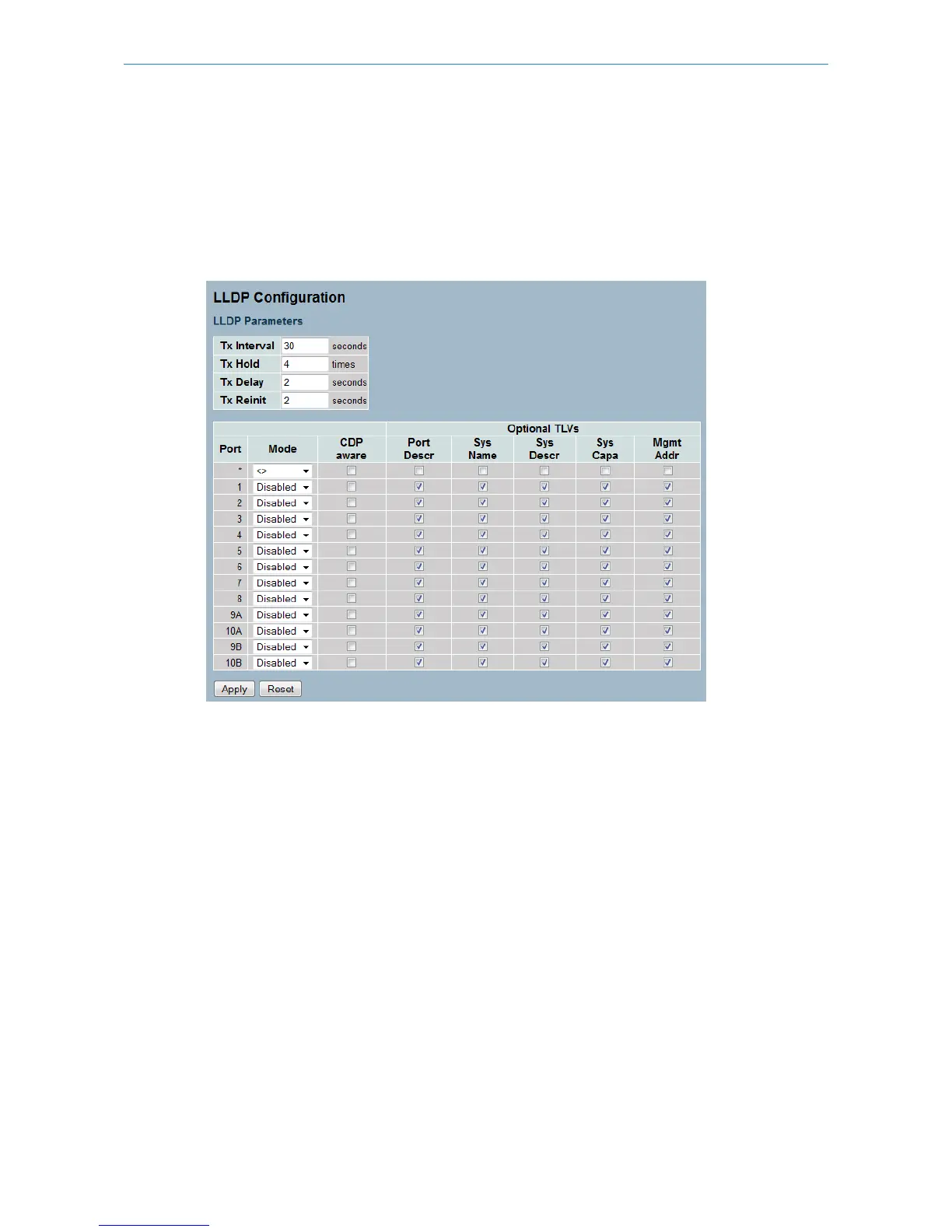 neighboring units, signaling that the LLDP information isn't valid anymore. Tx Reinit controls the amount of seconds