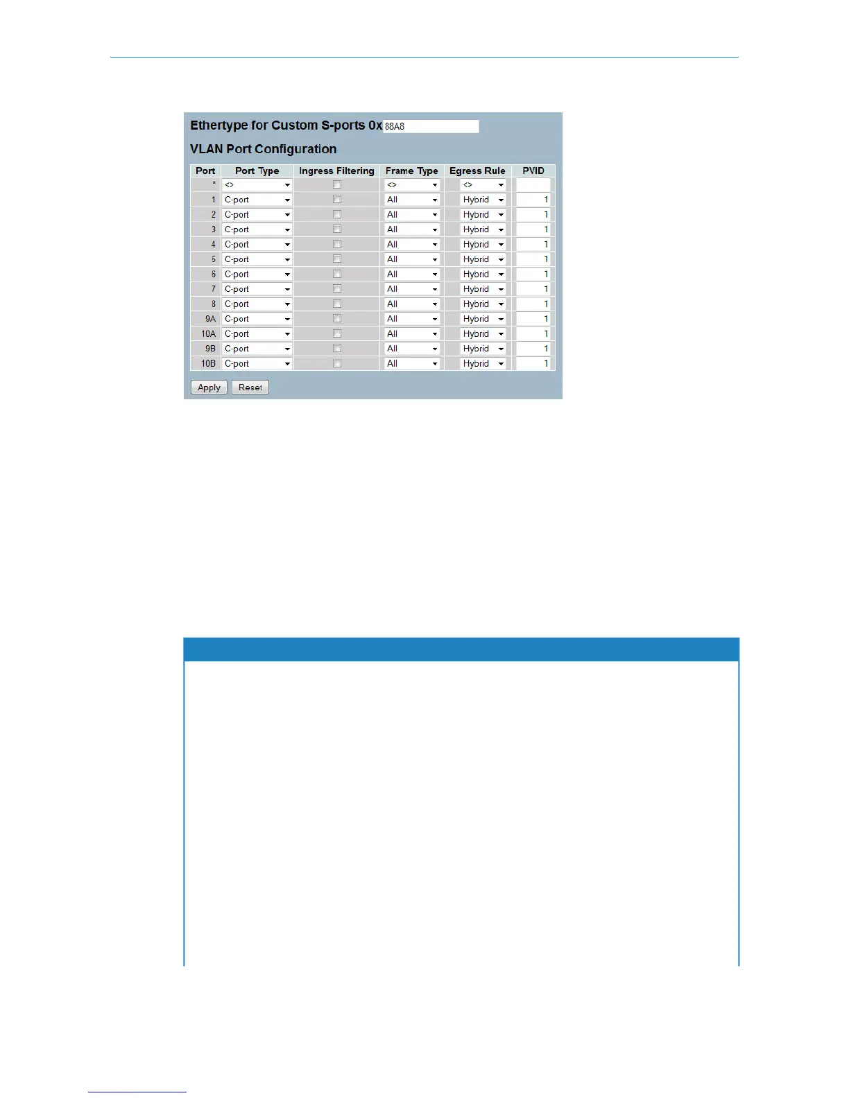 This field specifies the ether type used for Custom S-ports. This is a global setting for all the Custom S-ports. Custom