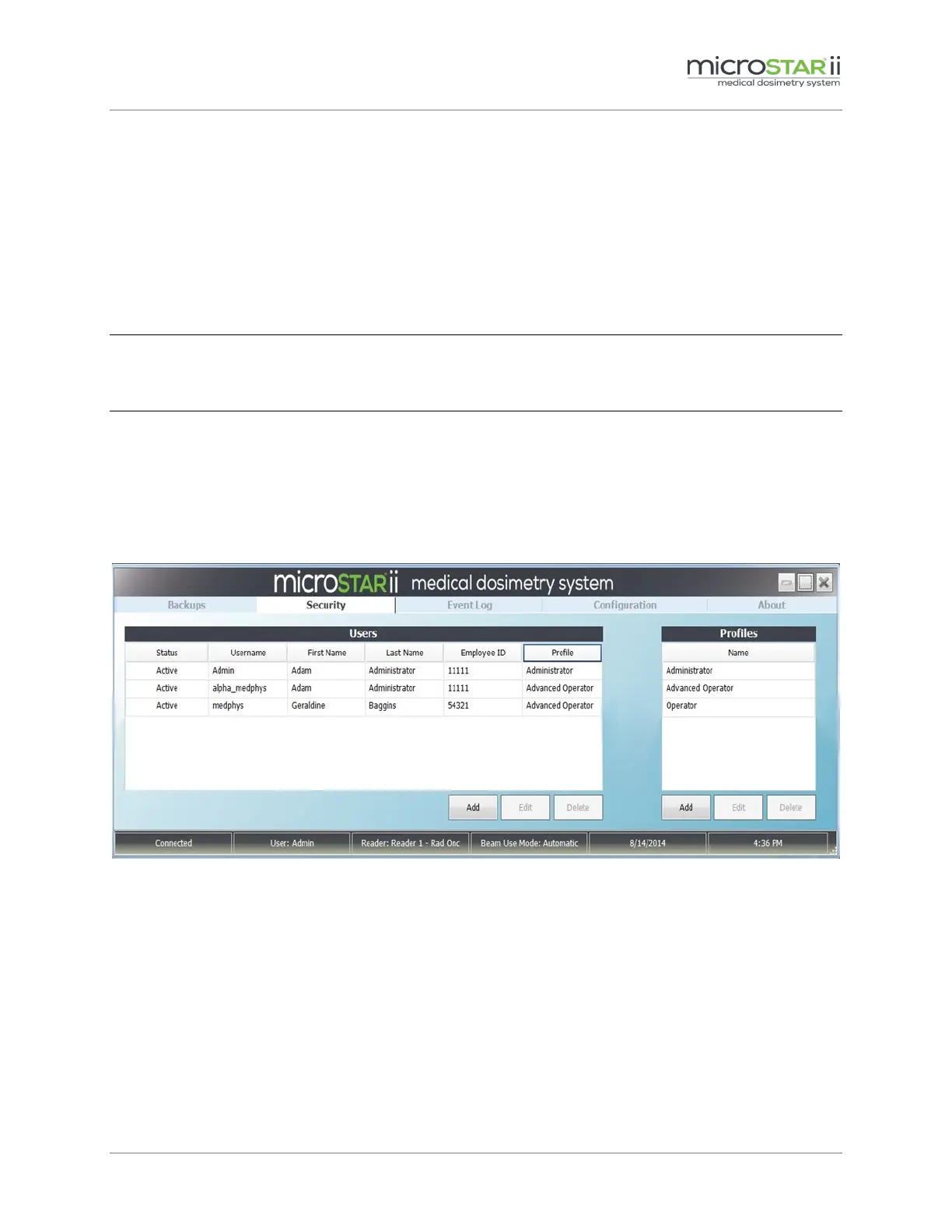 All profile administration is completed on the Security tab of the microSTARii software application.