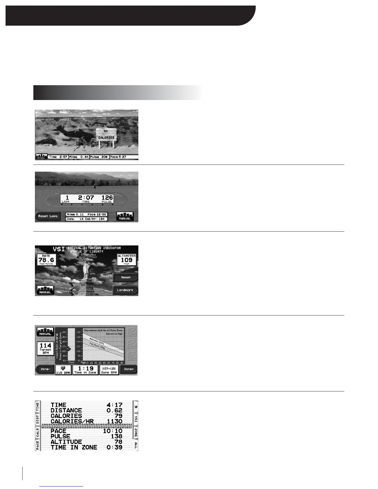 Calories per hour, Altitude Climbed, Climbing Rate, Zone Timer,