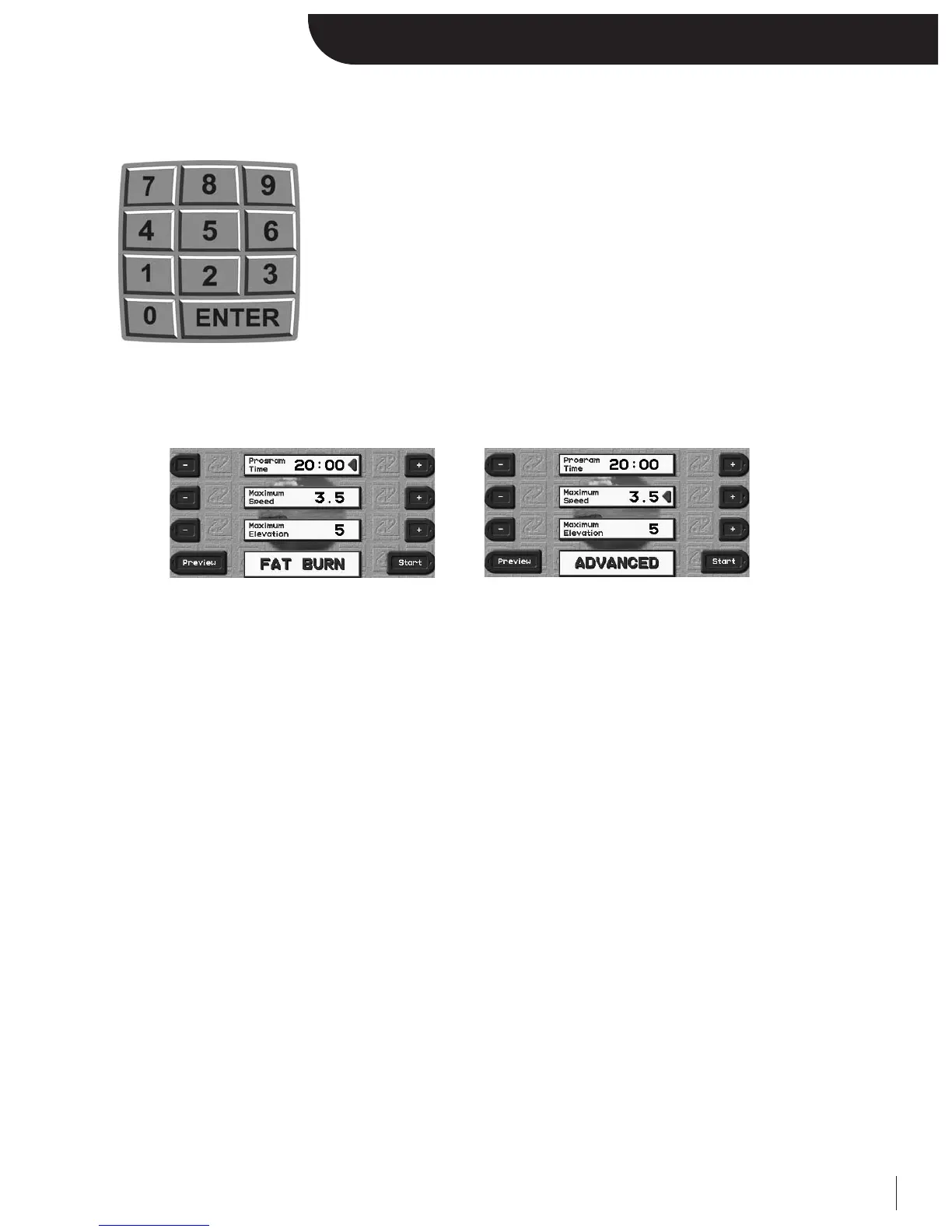 • In the 5 Built-in programs, the keypad can be used to enter the program’s maximum time, speed, and elevation.